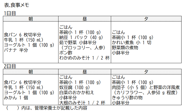 35-180 初回の在宅患者訪問栄養食事指導の時に、娘からいつも作っている食事内容のメモをもらい摂取量を把握した(表)。準備された食事はほぼ摂取し、間食はほとんどしない。この内容から優先すべき問題点である。最も適切なのはどれか。 1 つ選べ。