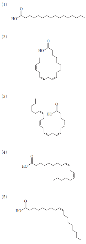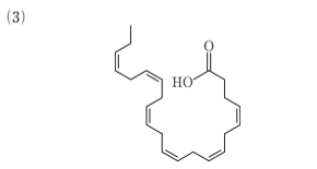 37-48 主にまぐろや青魚から摂取される n-3 系脂肪酸である。この脂肪酸の構造式として、最も適当なのはどれか。 1 つ選べ。
