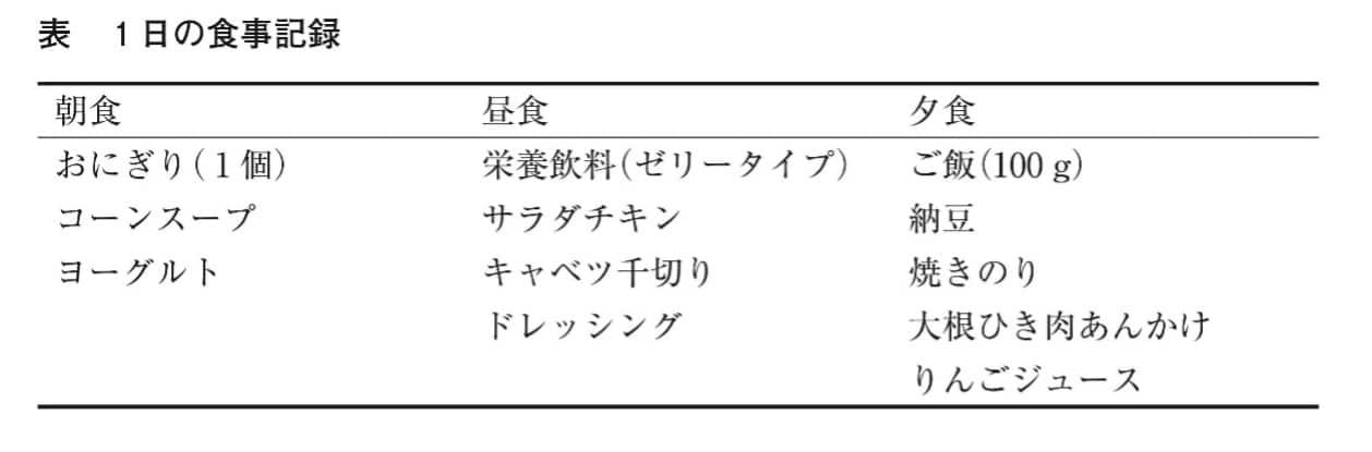 朝:おにぎり1個、昼:栄養飲料(ゼリータイプ)、夕:ご飯100g
