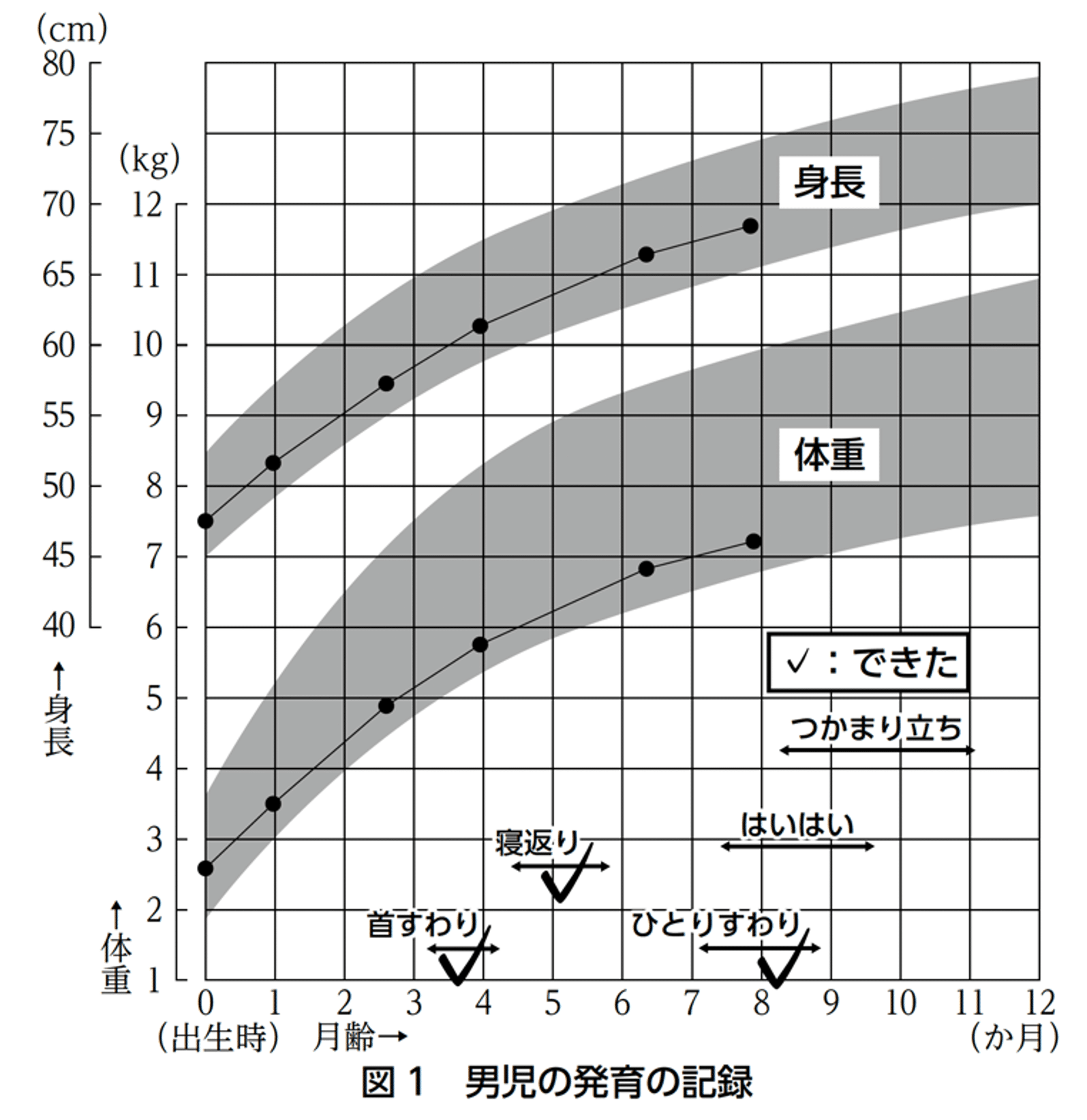 39-171 図1は、男児の出生時からの身長と体重の変化を、母親が母子健康手帳の乳児身体発育曲線の図に記録したものである。図から読み取った結果を踏まえた、母親への管理栄養士の発言として、最も適切なのはどれか。1つ選べ。
