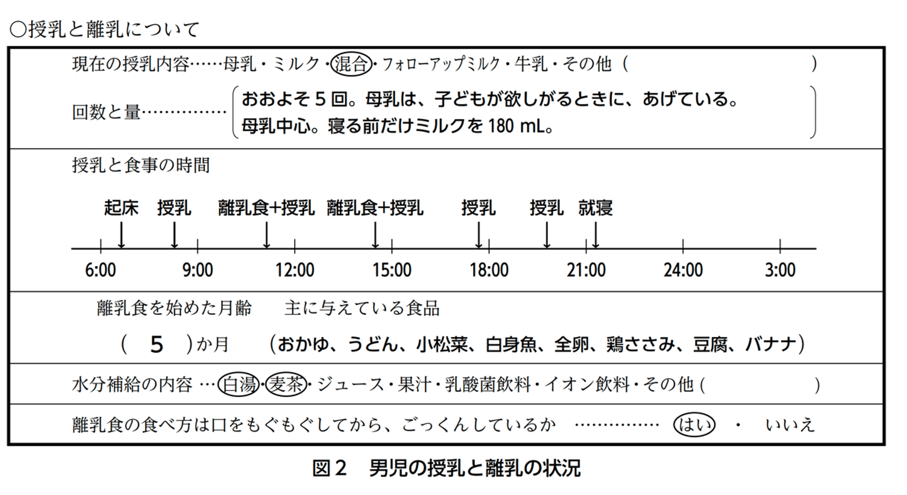 39-172 図2は、男児の授乳と離乳の状況を聞き取った内容である。この内容を踏まえた、母親への管理栄養士の助言として、最も適切なのはどれか。1つ選べ。