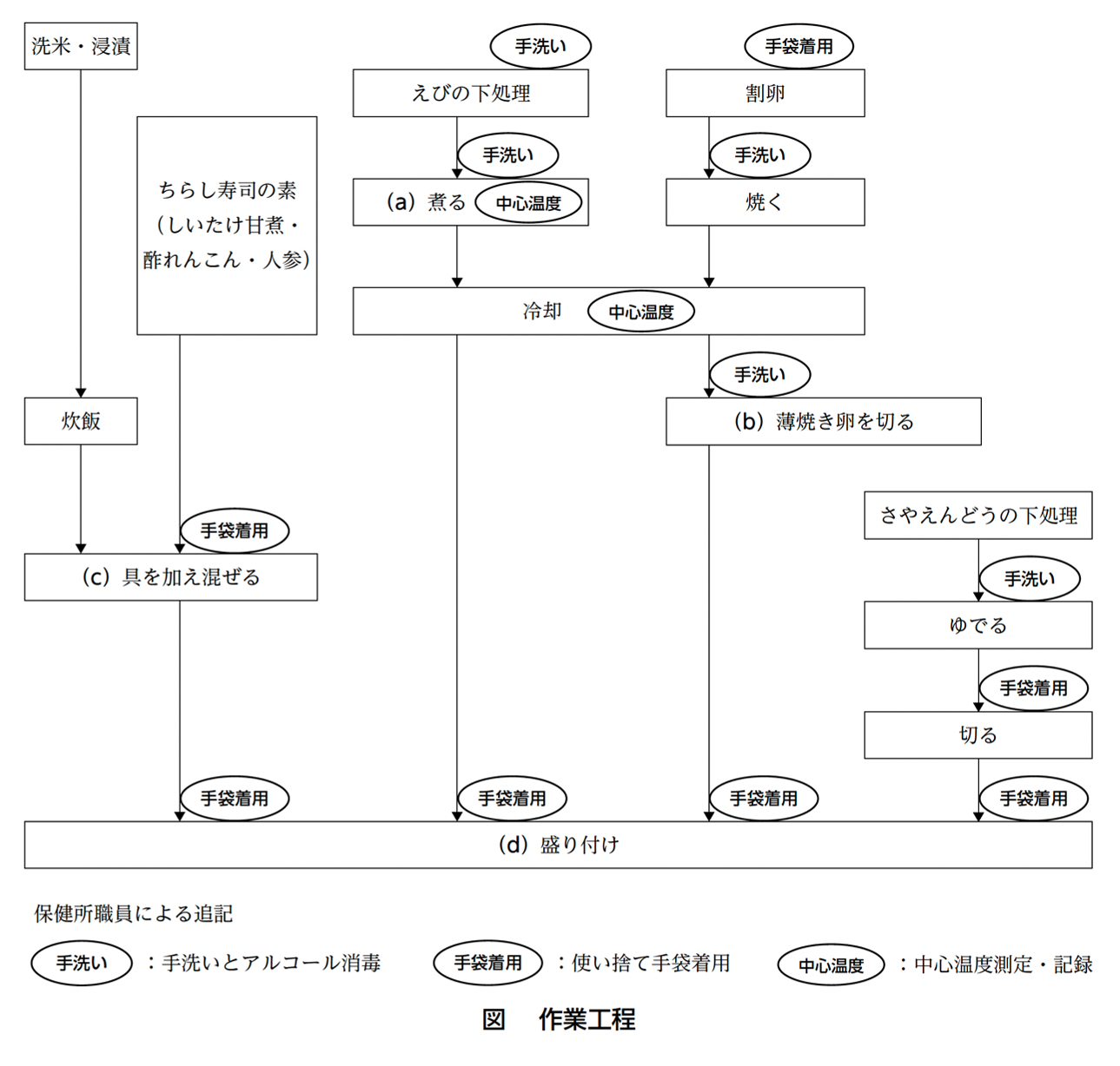 図は、ちらし寿司の作業工程に、保健所の職員が作業時の手洗い、中心温度測定、手袋着用の有無を聞き取り、追記したものである。ちらし寿司の材料は、米飯、ちらし寿司の素(しいたけ甘煮・酢れんこん・人参)、卵、さやえんどう、えびである。